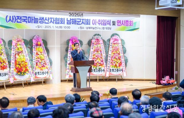 경남일간신문 | (사)전국마늘생산자협회 남해군지회(회장 김종준)는 지난 14일 남해마늘연구소 대강당에서 회원 80여 명이 참여한 가운데 ‘이·취임식 및 연시총회’를 개최했다.