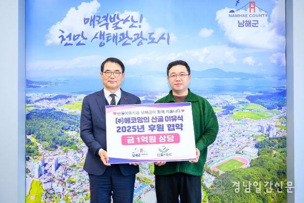 출생아들의 건강하고 안전한 성장을 응원하는 마음을 담아 2024년에 이어 2025년에도 계속 후원하기로 했다. 이날 협약식에는 장충남 남해군수와 오천호 대표가 참석했다.