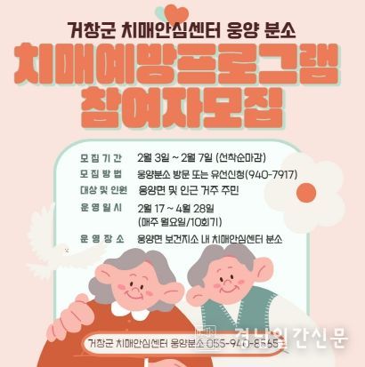 경남일간신문 | 거창군은 웅양면 지역주민을 대상으로 치매 예방프로그램 참여자를 2월 3일부터 7일까지 선착순 모집한다고 밝혔다.