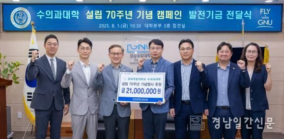 경남일간신문 | 경상국립대학교 수의과대학이 설립 70주년 기념행사를 준비하면서 발전기금 모금 캠페인을 펼처, 8월 1일 오전 대학본부 3층 접견실에서 발전기금 전달식을 개최했다.