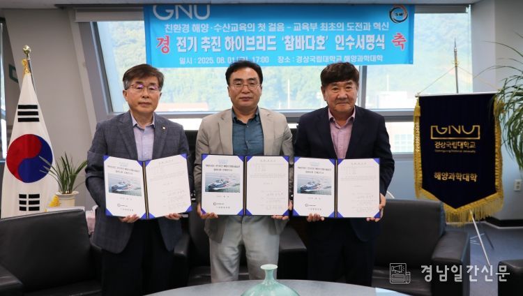 경남일간신문 | 경상국립대학교는 8월 1일 오후 5시 해양과학대학 학장실에서 ‘교육부 최초 전기 추진 하이브리드 해양수산탐사실습선 참바다호 인수 서명식’을 개최했다.