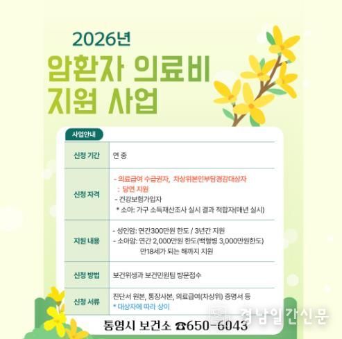 경남일간신문 | 통영시는 저소득층 성인, 소아 암환자들의 의료비 부담 경감을 위한 ‘암환자 의료비 지원사업’을 추진하고 있다고 26일 밝혔다.