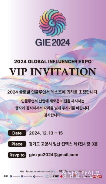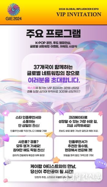 경남일간신문 | 전 세계 인플루언서와 기업들이 한자리에 모이는 ‘2024 글로벌 인플루언서 엑스포’가 오는 12월 13일부터 15일까지 경기도 고양시 일산 킨텍스에서 개최된다.