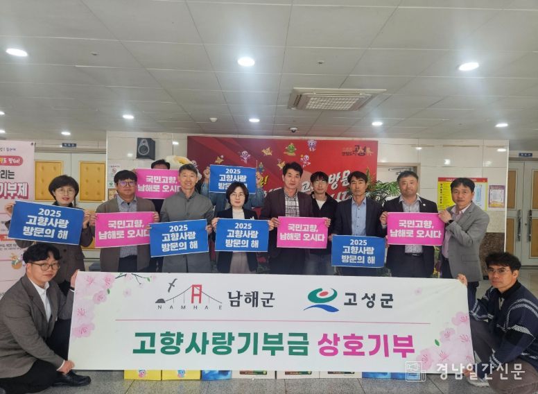 경남일간신문 | 남해군 문화체육과와 고성군 스포츠산업과가 지난 28일 고성군청에서 지역 간 상생협력 강화를 위한 고향사랑기부금 상호기부 기탁식을 진행했다.