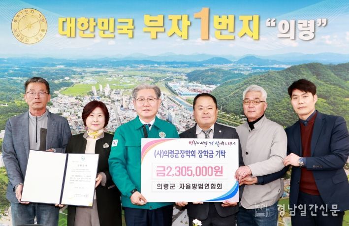 경남일간신문 | 의령군 자율방범연합회는 지난 31일 의령군청을 방문하여 의령군 인재양성을 위해 회원들이 손수 모은 장학금 2,305,000원을 의령군장학회에 기탁했다.