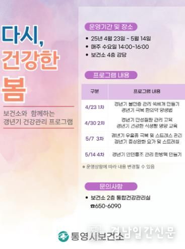 경남일간신문 | 통영시는 갱년기 신체적·정신적 건강문제 관리를 위해 오는 4월 23일부터 5월 14일까지 매주 수요일(14:00~16:00) 총 8차시 갱년기 건강관리 프로그램을 진행한다.