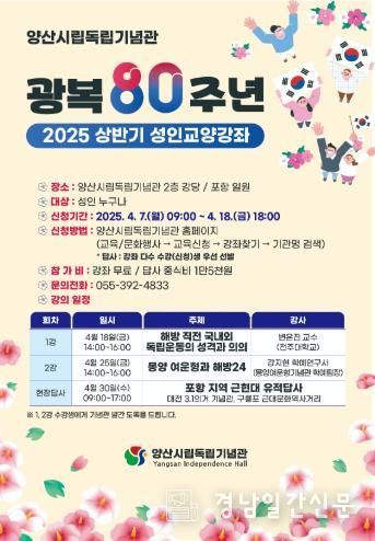 경남일간신문 | 양산시립독립기념관에서 4월 18일부터 30일까지 총 3회에 걸쳐에 ‘광복 80주년 2025 양산시립독립기념관 상반기 성인교양강좌’를 실시한다고 밝혔다.