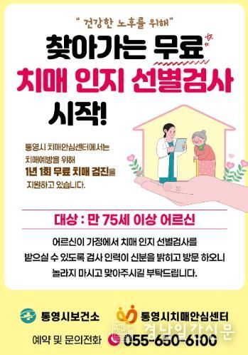 경남일간신문 | 통영시는 4월부터 7월까지 4개월간 치매고위험군 및 만 75세 이상 지역주민 대상으로 생활터로 찾아가는 치매조기검진을 실시한다고 14일 밝혔다.