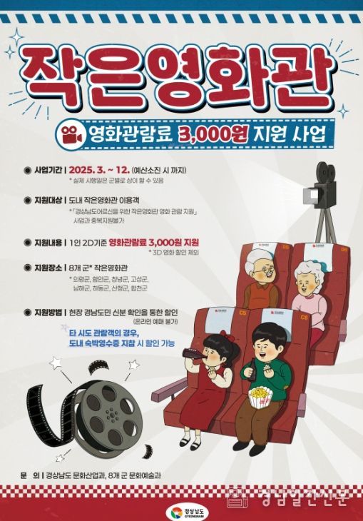 이번 사업은 작은영화관의 인지도 강화와 운영 활성화를 위해 경남도에서 추진하는 시책으로, 관람객 1인당 영화관람료 3,000원을 지원한다.