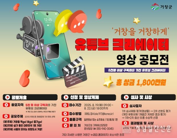 경남일간신문 | 거창군은 구독자 수 5천 명 이상을 보유한 유튜브 크리에이터를 대상으로 ‘거창을 거창하게’ 유튜브 영상 공모전을 개최한다.