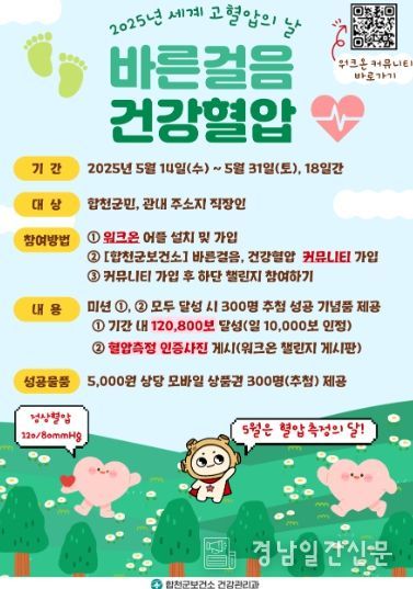 경남일간신문 | 합천군은 세계 고혈압의 날(5월 17일)을 맞아 오는 5월 14일부터 31일까지 18일간, 모바일 걷기 앱 ‘워크온(WalkOn)’ 을 활용한 ‘바른걸음, 건강혈압 챌린지’를 운영한다.