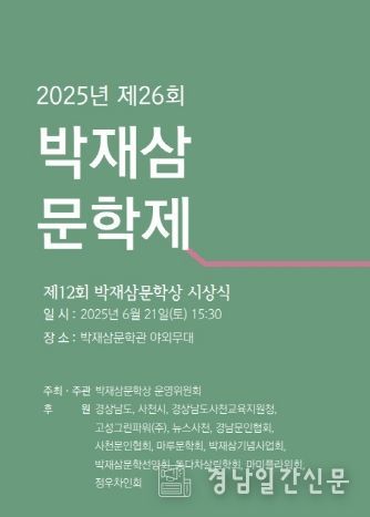 경남일간신문 | 한국 서정시의 순수성과 향토적 정서를 빛낸 사천 출신 시인 고(故) 박재삼의 문학세계를 기리는 제26회 박재삼문학제가 오는 6월 20일·21일 이틀간 사천시 박재삼문학관 일원에서 개최된다.
