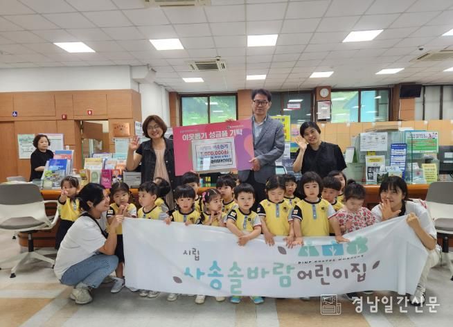 경남일간신문 | 양산시 동면 소재 시립사송솔바람어린이집은 원아 및 교사들이 함께 지난 16일 동면행정복지센터를 방문해 아나바다 나눔 바자회 수익금 100만원을 동면행정복지센터에 기탁했다.