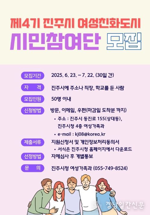 경남일간신문 | 진주시는 여성친화도시 조성을 위한 시민참여의 기반을 확대하기 위해 ‘제4기 여성친화도시 시민참여단’을 모집한다.