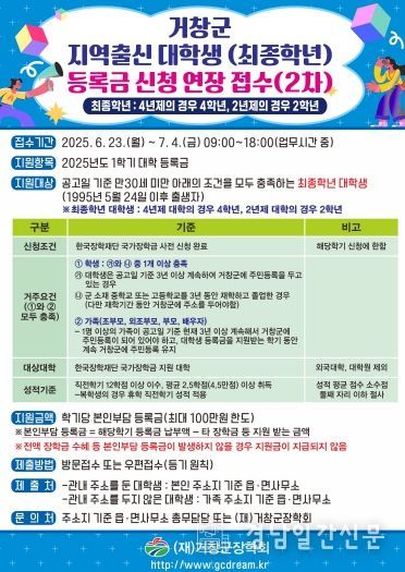 경남일간신문 | (재)거창군장학회는 최종학년 대학생의 본인부담 등록금을 100만 원까지 지원하는 ‘거창군 지역출신 대학생 등록금 지원사업’의 접수 기간을 당초 5월 23일부터 6월 20일까지였던 일정에서 오는 7월 4일까지 2주간 연장한다고 밝혔다.