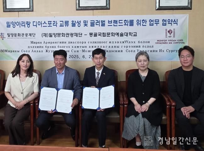 경남일간신문 | 밀양문화관광재단은 27일 몽골 울란바토르에서 몽골국립문화예술대학교(총장 친바트 바테르덴(Chinbat Bat-erdene))와 밀양아리랑의 세계화 및 디아스포라 문화교류 확산을 위한 업무협약(MOU)을 체결했다고 밝혔다.