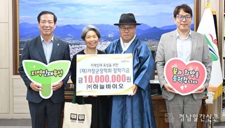 남상면에 위치한 전통 부각 제조 기업 ㈜하늘바이오 농업회사법인(대표 윤효미)는 지역 학생들의 교육환경 개선과 인재 육성에 기여하고자 영업 수익 일부인 1,000만 원을 거창군장학회에 기탁했다.