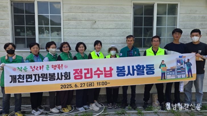 경남일간신문 | 개천면자원봉사회(회장 김낙문)는 6월 27일 개천면 나동마을 기초생활수급자 가정을 방문해'작은 정리! 큰 행복!'이라는 슬로건 아래 정리수납 봉사활동을 실시했다.