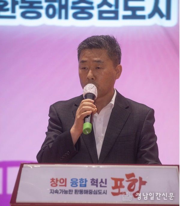 신복용 명예대회장은 축사에서 ”50만 시민은 굉장히 침착하고 대응 능력이나 기후 환경에 대해서 뛰어난 능력을 가지고 있다고 생각한다“면서 ”좀 더 좋은 환경을 만들고 보전하면서 아름다운 포항시를 만들어가기를 간절히 희망한다“고 말했다..