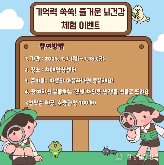 경남일간신문 | 함양군보건소는 치매에 대한 인식을 높이고, 치매안심센터를 더 친숙하게 느낄 수 있는 환경을 조성하고자 ‘기억력 쑥쑥! 즐거운 뇌 건강 체험 이벤트’를 오는 7월 7일부터 18일까지 운영한다.