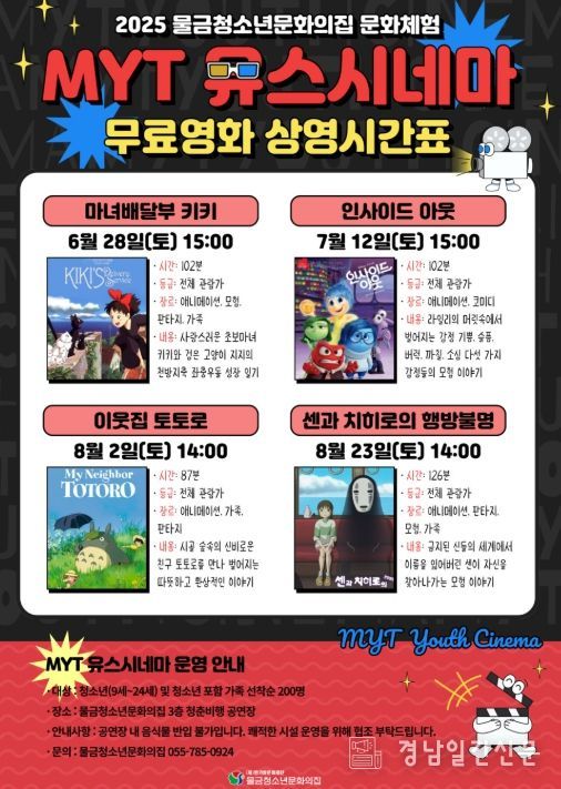 경남일간신문 | 양산시 물금청소년문화의집은 6월 28일부터 8월 23일까지 청춘비행 공연장에서 청소년과 가족이 함께하는 문화체험 프로그램 ‘MYT 유스시네마(Youth Cinema)’를 운영한다.