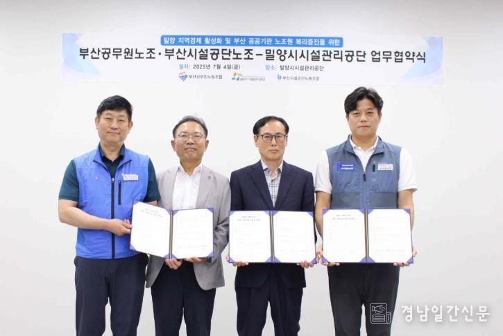 경남일간신문 | 밀양시시설관리공단은 공단 본부 회의실에서 부산공무원노동조합, 부산시설공단노동조합과 노조원 복리증진 및 밀양시 생활 인구 유입, 관광 활성화를 위한 업무협약을 체결했다고 7일 밝혔다.