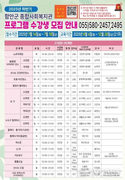 경남일간신문 | 함안군 종합사회복지관은 군민들의 건전한 여가선용과 지역사회 복지향상을 위해 오는 14일부터 18일까지 2025년 하반기 프로그램 수강생을 모집한다.