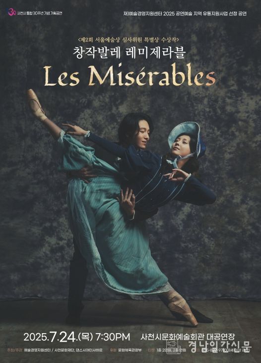 경남일간신문 | 사천문화재단은 예술경영지원센터가 주최하고 문화체육관광부가 후원하는 ‘2025 공연예술지역유통지원사업’의 선정작으로 국비 64,800천원을 지원받아 창작발레 '레미제라블'를 선보인다. 이번 공연은 오는 7월 24일 오후 7시 30분, 사천시문화예술회관 대공연장에서 만나 볼 수 있다.