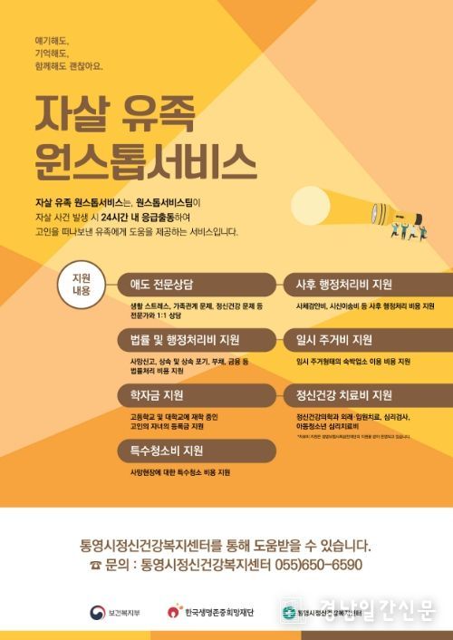 경남일간신문 | 통영시는 자살로 인해 가족을 잃은 유족들이 겪는 심리적 충격과 생활의 어려움을 덜어주기 위한 ‘자살유족 원스톱서비스 지원사업’을 7월부터 본격 시행한다고 9일 밝혔다.