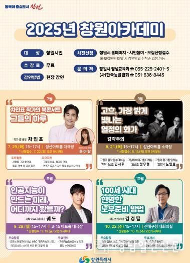 모든 강연은 시민 누구나 무료로 참여 가능하고, 각 강연 일주일 전부터 창원시 홈페이지에서 사전신청하면 된다.