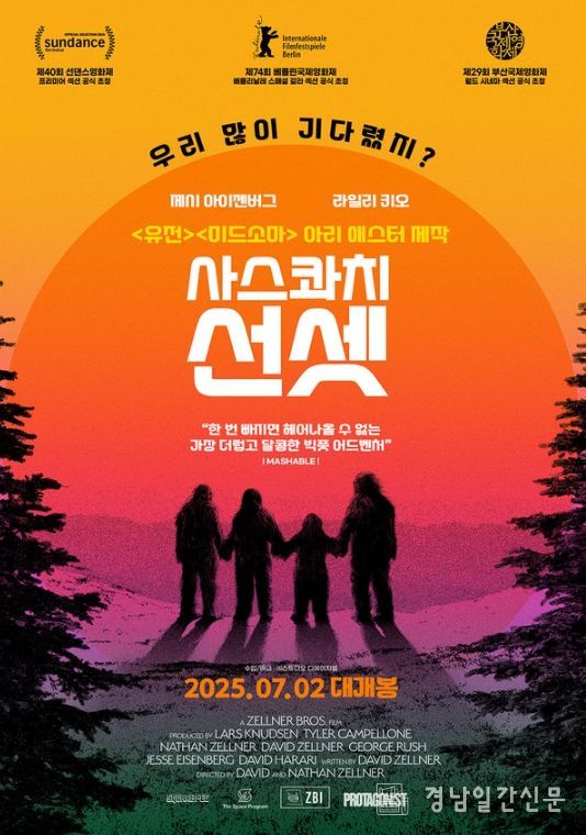 경남일간신문 | '유전''미드소마' 아리 애스터 감독이 총괄 프로듀서로 참여했으며, 선댄스, 베를린, SXSW, 부산을 발칵 뒤집은 귀여운 문제작 '사스콰치 선셋'이 7월 16일(수) 바로 오늘부터 극장 동시 IPTV & VOD 서비스를 시작한다.[감독: 데이비드 젤너, 나단 젤너 | 제작: 아리 애스터 | 출연: 제시 아이젠버그, 라일리 키오, 나단 젤너, 크리스토프 자야츠 데넥 | 장르: 코미디, 어드벤처 | 수입/배급: ㈜스튜디오 디에이치엘]