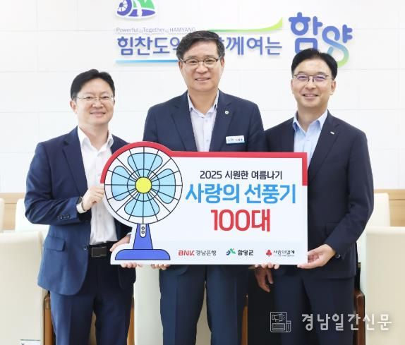 경남일간신문 | 함양군은 21일 비엔케이(BNK) 경남은행 함양지점에서 함양군청을 방문해 취약계층에 전달해 달라며 선풍기 100대(약 300만 원 상당)를 기부했다고 밝혔다.