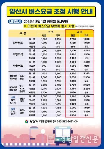 경남일간신문 | 양산시는 8월 1일부터 시내·마을버스 요금을 인상하고, 동시에 어린이 버스요금 무료화를 시행한다고 밝혔다.