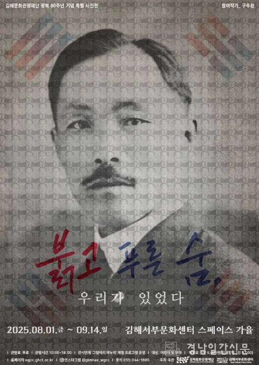 경남일간신문 | (재)김해문화관광재단은 광복 80주년을 맞아 시민과 함께 자유와 독립의 가치를 되새기는 특별 사진전 『붉고 푸른 숨, 우리가 있었다』를 오는 8월 1일부터 9월 14일까지 김해서부문화센터 스페이스 가율에서 개최한다.