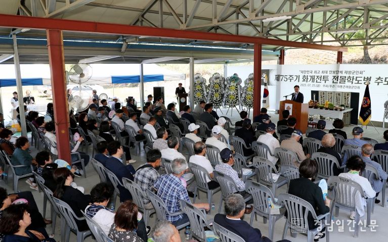 경남일간신문 | 하동군이 25일 화개면 궁도장에서 6·25 전쟁 당시 북한군과 싸우다 산화한 학도병들의 영령을 기리는 ‘제75주기 화개전투 전몰학도병 추모제’를 거행했다.