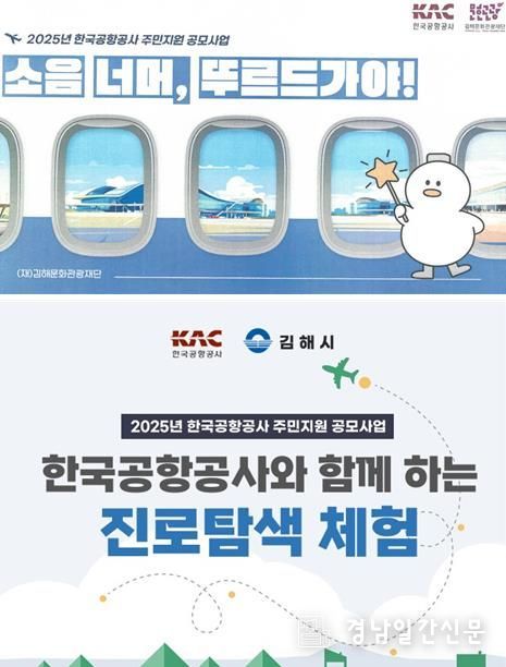 경남일간신문 | 김해시는 2025년 한국공항공사 주민지원 공모사업에 ‘소음 너머, 뚜르드 가야’와 ‘한국공항공사와 함께하는 진로탐색 체험’ 사업이 선정됐다고 29일 밝혔다.