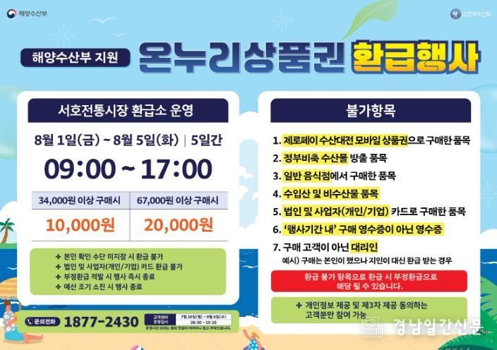 이번 행사는 여름 휴가철을 맞아 소비자의 수산물 물가 체감 완화와 소비 촉진, 전통시장 활성화를 목적으로 마련됐으며, 해양수산부 주관으로 서호전통시장 내 행사 참여 점포에서 국내산 수산물을 구매한 소비자가 영수증을 행사 기간 내 환급소에 제출하면 구매 금액에 따라 최대 2만원까지 온누리상품권으로 환급해주는 방식이다.