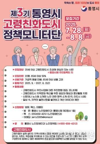 모니터단의 지원 자격은 20세 이상으로 통영시 고령친화도시 조성에 관심을 둔 시민으로 2년간(2025년 9월~2027년 8월) 활동이 가능한 자면 누구나 신청이 가능하다.
