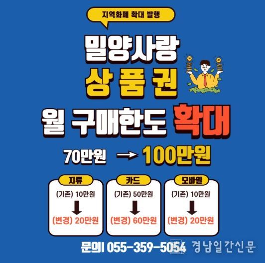 경남일간신문 | 밀양시는 지역경제 활성화를 위해 밀양사랑상품권의 월 구매 한도를 8월 1일부터 기존 70만 원에서 100만 원으로 확대한다고 밝혔다.
