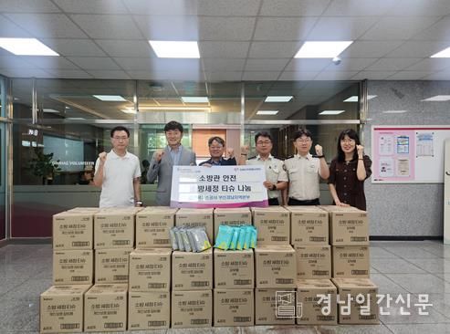 경남일간신문 | 김해시자원봉사센터는 한국가스공사 부산경남지역본부에서 김해동부소방서에 소방세정티슈 60박스를 전달했다고 30일 밝혔다.