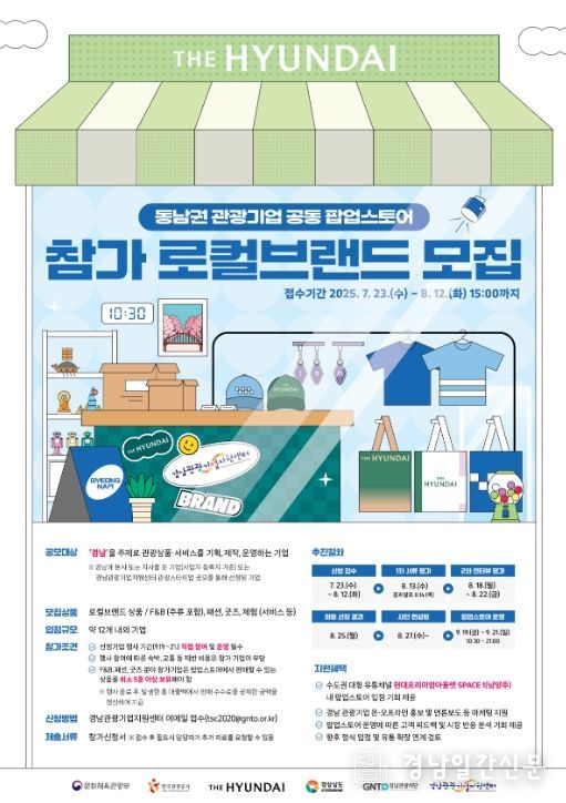 경남일간신문 | 경상남도는 30일 오는 9월 경남관광재단 관광기업지원센터 주관으로 현대프리미엄아울렛 남양주점에서 개최되는 '2025 부울경 관광기업 공동 팝업스토어'에 참가할 경남 지역 로컬브랜드 12개 내외 기업을 모집한다고 밝혔다.