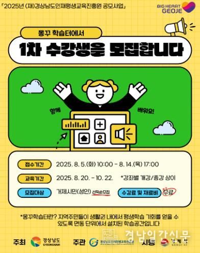 경남일간신문 | 거제시가 지난 3월 (재)경상남도인재평생교육진흥원이 주최한 ‘2025년 면동 평생학습센터 구축 지원사업’에 선정되어 도비 2,500만원을 확보했다.