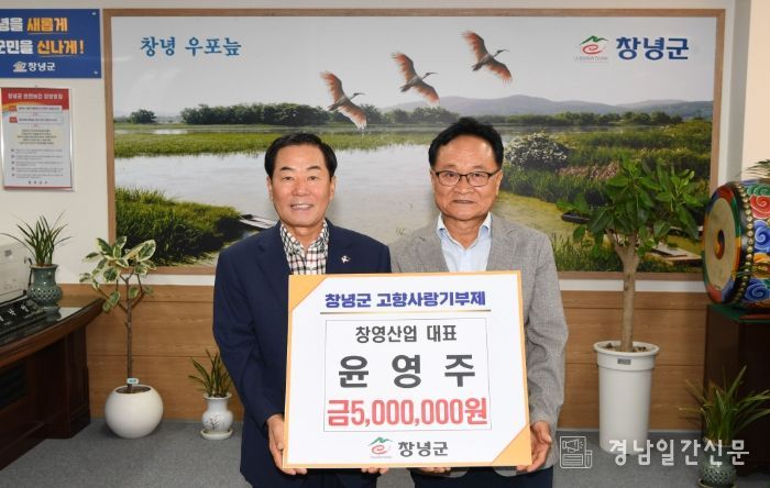 경남일간신문 | 창녕군은 지난 30일 윤영주 창영산업 대표가 고향사랑기부제에 동참해 기부금 500만 원을 기탁했다고 밝혔다.