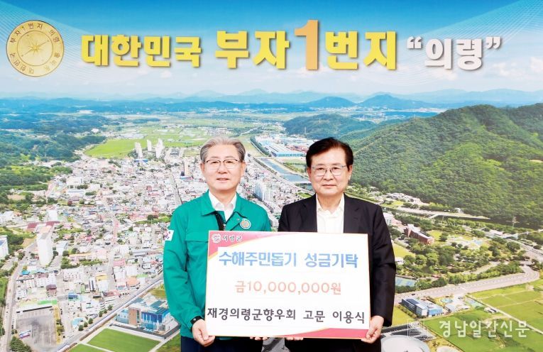 경남일간신문 | 의령군은 재경의령군향우회 이용식 고문이 지난 30일 의령군청을 찾아 최근 집중호우로 큰 피해를 입은 지역 수해 이재민들을 위해 성금 1,000만원을 기탁했다고 밝혔다.