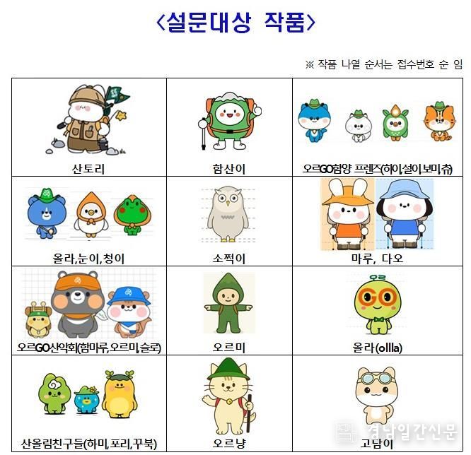 경남일간신문 | 함양군은 15개 명산 완등 인증사업 ‘오르GO 함양’의 공식 캐릭터 선정을 위해, 캐릭터 공모전 1차 채택심사 통과한 12건을 대상으로 대국민 선호도 조사를 오는 8월 1일부터 10일까지 실시한다고 밝혔다.