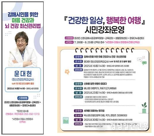 첫 강의는 오는 16일 오후 2시, 장유도서관 공연장에서 시민 250명을 대상으로 진행되며, 서울대학교병원 정신건강의학과 윤대현 교수가 ‘김해시민을 위한 마음 건강과 뇌 건강 최신 관리법’을 주제로 강연할 예정이다.