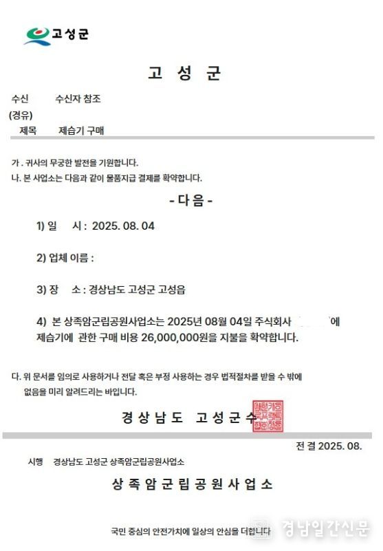 경남일간신문 | 최근 고성군 관내에서 공무원 사칭과 허위 공문서를 활용한 물품 구매 유도 사기 사건이 발생해 각별한 주의가 요구된다.