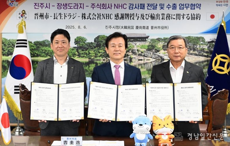 이날 협약식에는 조규일 진주시장이 참석해 일본 내 진주시 제품의 인지도 제고와 수출 확대에 기여한 ㈜NHC에 감사패도 전달했다.