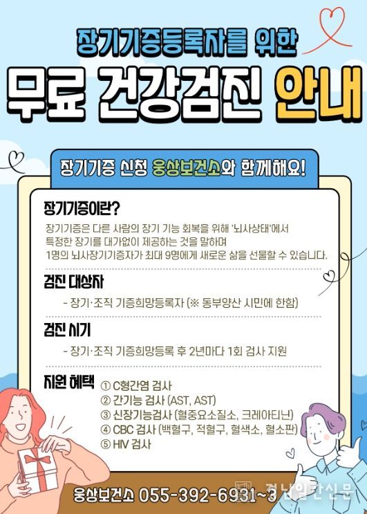 경남일간신문 | 양산시 웅상보건소는 동부양산 장기기증 희망등록자를 대상으로 오는 8월 11일부터 무료 건강검진을 실시한다고 밝혔다.