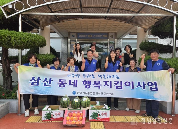 경남일간신문 | 한국 자유총연맹 고성군 삼산분회(회장 구향순)는 8월 7일, ‘삼산 동네 행복지킴이사업’의 일환으로 여름철 수박 나눔행사를 펼치며 지역사회에 따뜻한 정을 전했다.